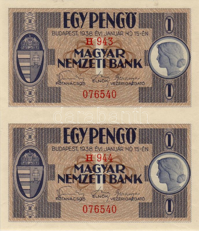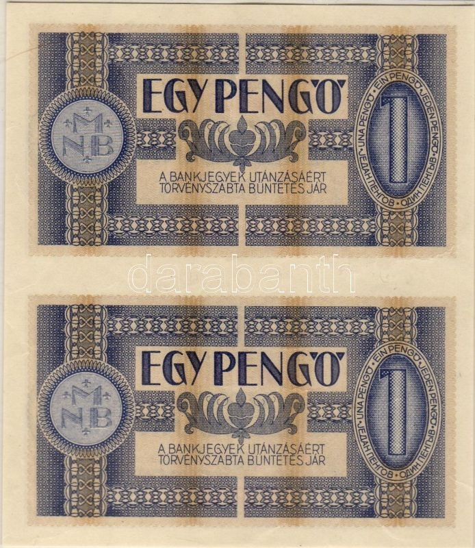 1938. 1P 2x összefüggő párban T:I https://www.darabanth.com/hu/31-Gyorsarveres/31.0/Numizmatika/Magyar-es-kulfoldi-bankjegyek-Hungarian-and-foreign-banknotes~222/1938-1P-2x-osszefuggo-parban-TI~II59514
