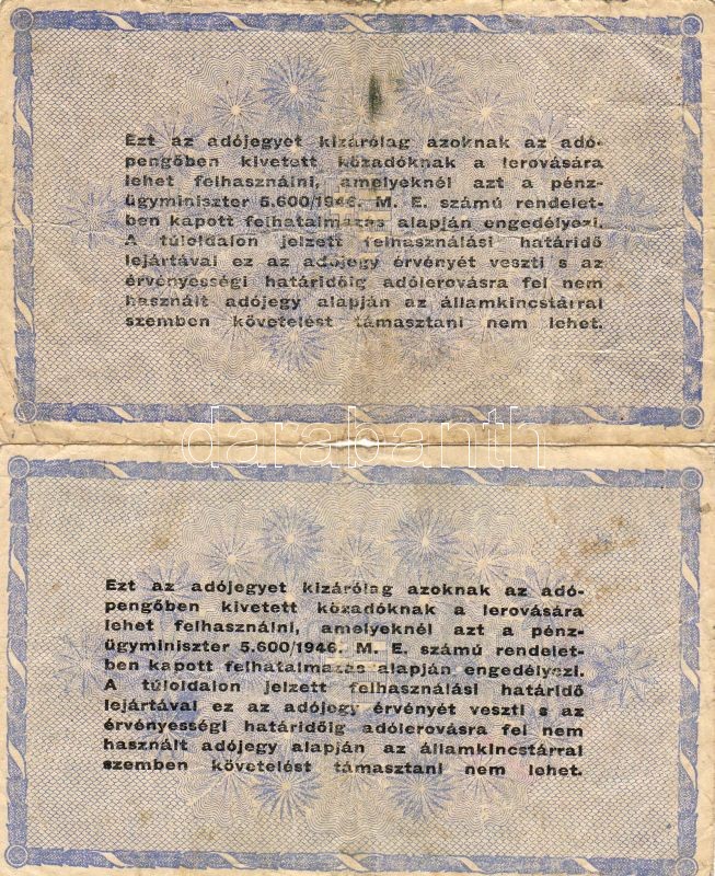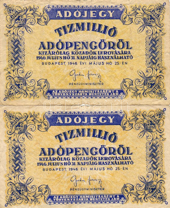 Leírás: 1946. 10.000.000Adóp. vízjeles papíron, fordított címerrel (2x) T:II/III,III/IV