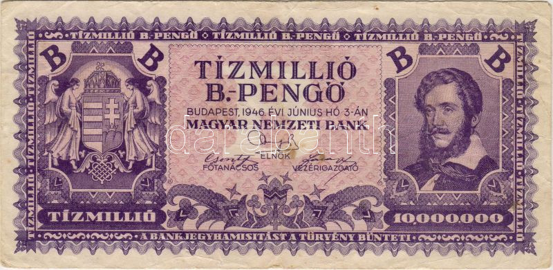 1946. 10.000.000B.-pengő T:II/III https://www.darabanth.com/hu/31-Gyorsarveres/31.0/Numizmatika/Magyar-es-kulfoldi-bankjegyek-Hungarian-and-foreign-banknotes~222/1946-10000000B-pengo-TIIIII~II59330