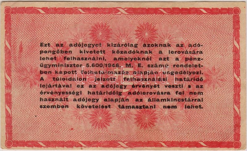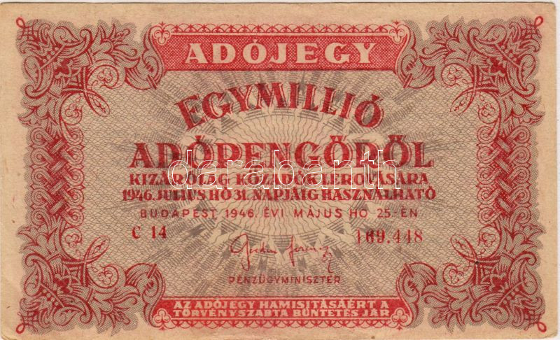 Leírás: 1946. 1000.000Adóp. hatjegyű sorszámmal, vízjeles papíron, fordított címerrel T:II