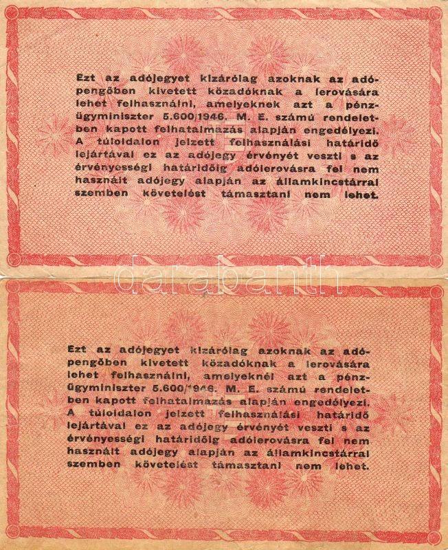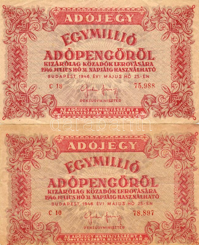 Leírás: 1946. 1000.000Adóp. ötjegyű sorszámmal, vízjeles papíron, fordított címerrel (2x), benne elcsúszás, lemezhibák T:II/III