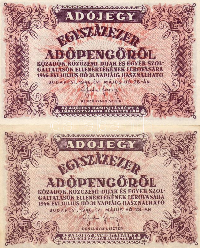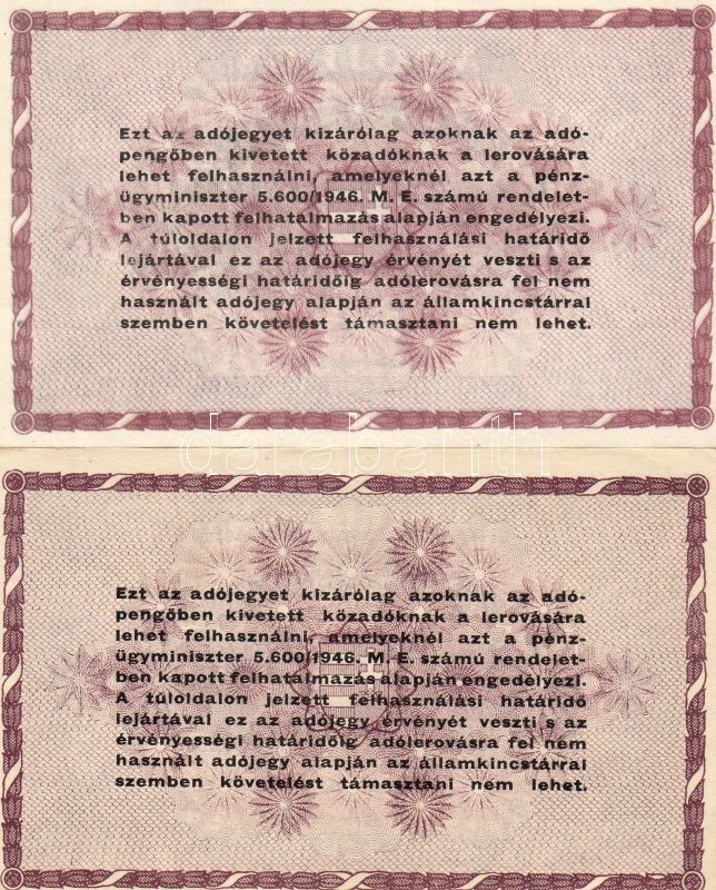 Leírás: 1946. 100.000Adóp. fehér, vízjel nélküli papíron, számozás nélkül, 5600-as téves rendeletszám, 2 klf színvariáns T:I