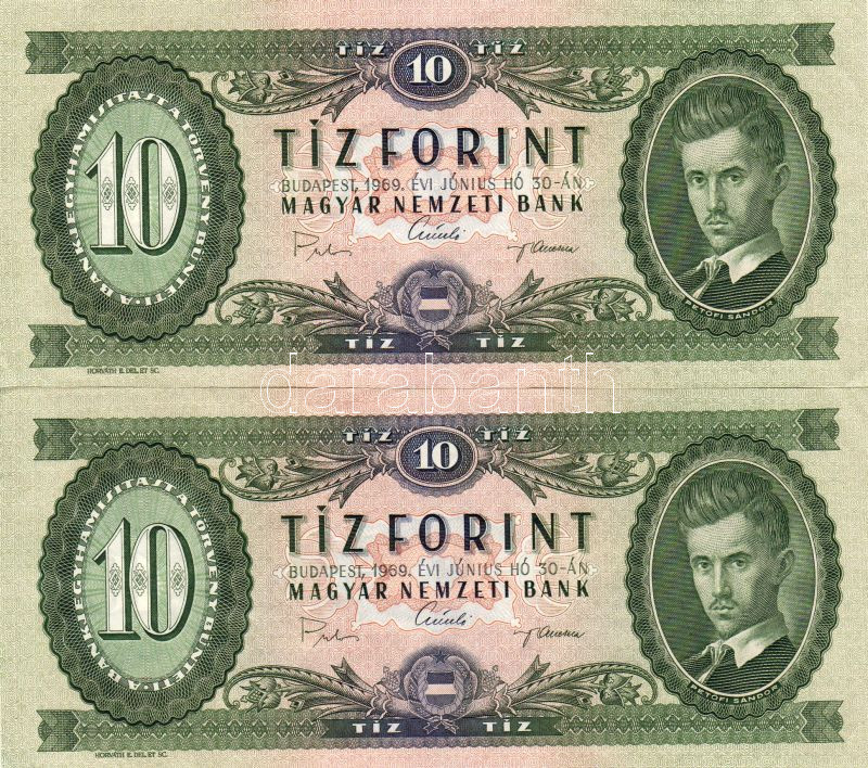 Leírás: 1969. 10Ft (2x) Csak egy szám ugrással ugyanabból a sorozatszámból, mindkettő hátoldalán jobb oldalon illesztőkereszt darabja jól láthatóan! T:I-