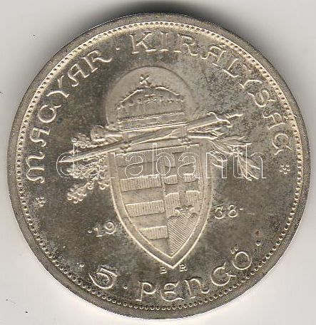 1938. "Szt. István" 5P ezüst T:1/2 https://www.darabanth.com/hu/31-Gyorsarveres/31.0/Numizmatika/Magyar-es-magyar-verdejelu-fem-es-ezustpenzek-Hungarian-and-Hungarian-mint-marked-metal-and-silver~231/1938-Szt-Istvan-5P-ezust-T12~II59484