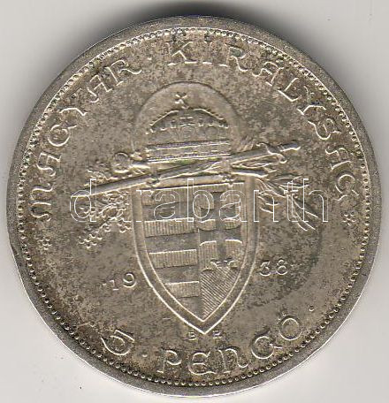 1938. "Szt. István" 5P ezüst T:2 kis ph. https://www.darabanth.com/hu/31-Gyorsarveres/31.0/Numizmatika/Magyar-es-magyar-verdejelu-fem-es-ezustpenzek-Hungarian-and-Hungarian-mint-marked-metal-and-silver~231/1938-Szt-Istvan-5P-ezust-T2-kis-ph~II59482