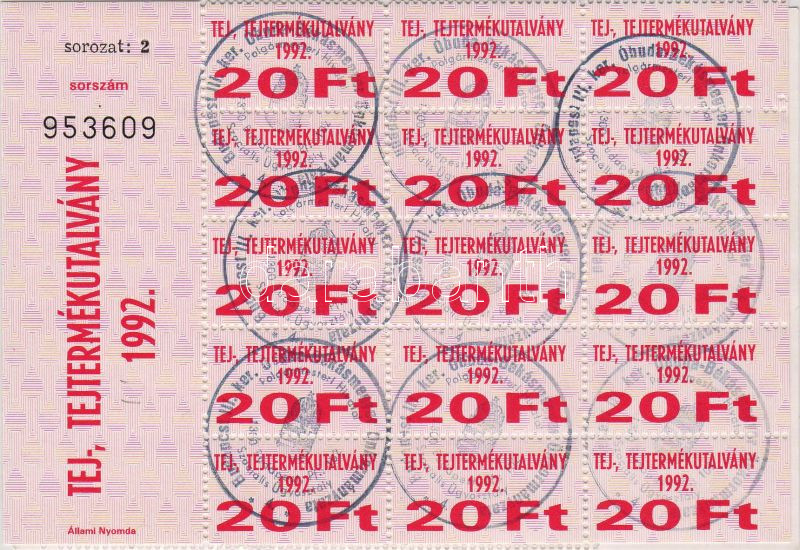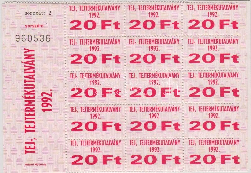 Leírás: 1992. Tejtermékutalvány 20Ft 15-ös ív + 15-ös ív bélyegzővel T:I