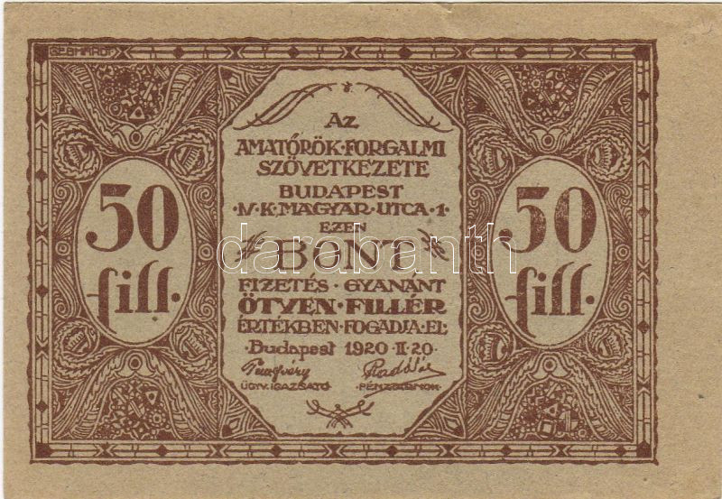 Budapest 1920. "Amatőrök Forgalmi Szövetkezete" 50f T:II https://www.darabanth.com/hu/31-Gyorsarveres/31.0/Numizmatika/Papirpenzek-szuksegpenzek-hadifogolypenzek-Banknotes-notgeld-warprisoner-notes~223/Budapest-1920-Amatorok-Forgalmi-Szovetkezete-50f-TII~II59259