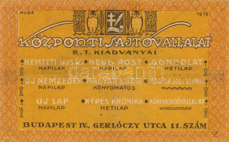 Leírás: Budapest, Központi Sajtóvállalat R.T. 20f 1919. T:II