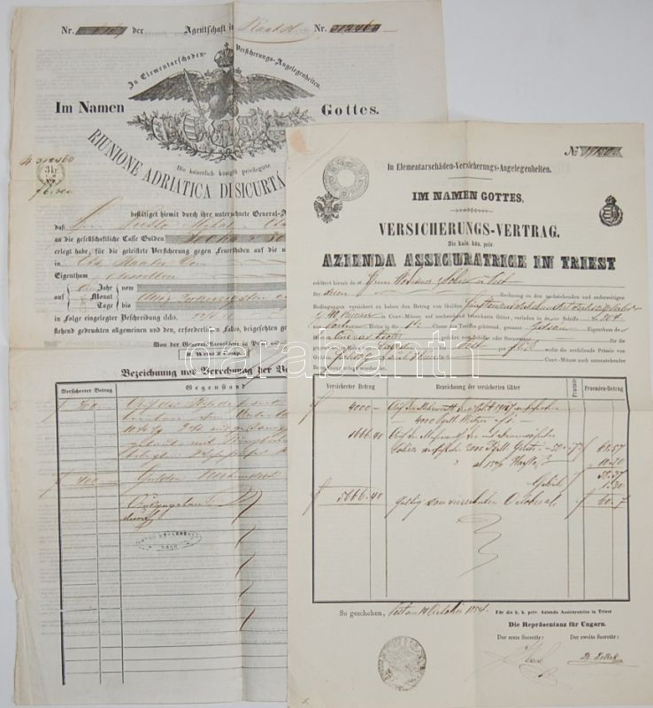Leírás: 1854-57 2 db trieszti biztosítási kötvény