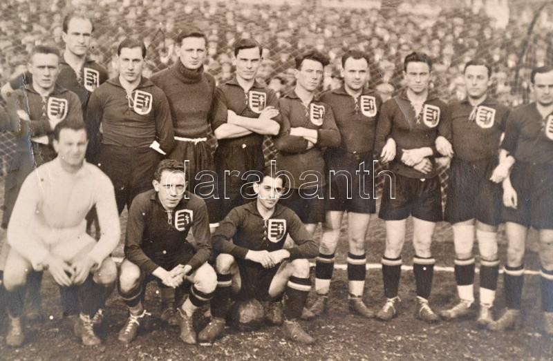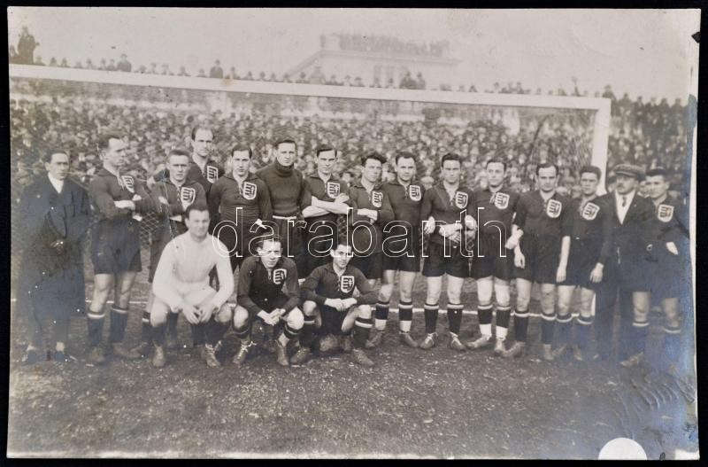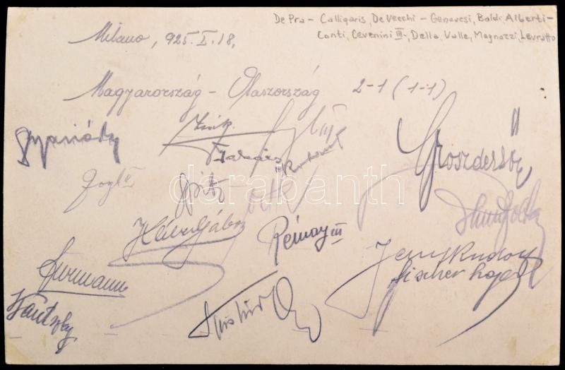 1925 A Magyarország - Olaszország labdarúgó mérkőzésen készült fotó a magyar csapatról, hátoldalán a csapat játékosok aláírásával / 1925 Hungary-Italy football match. Photo of the Hungarian team with signatures of the Hungarian players. 18x12 cm