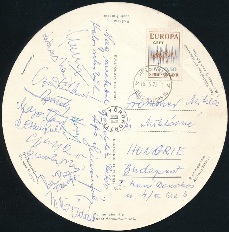Leírás: 1972 Magyar színészek és színésznők aláírásai Helsinkiből küldött levelezőlapon: Major Tamás, Kohut Magda, Lukács Margit, Vörös Ádám, stb.