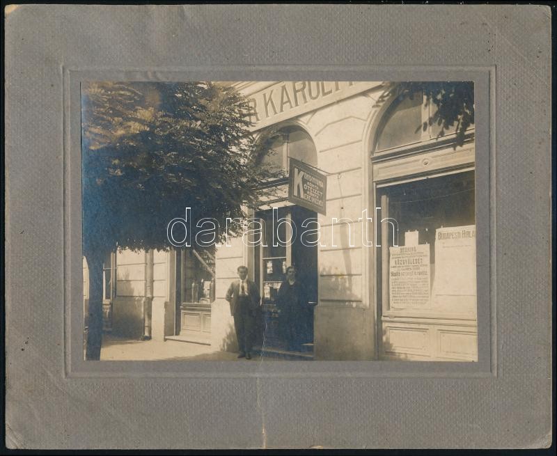 Leírás: 1927 Szarvas, Müller Károlyné Könyvnyomdája, az üzlet előtt ifj. Müller Károly és édesanyja, fotó, kartonra ragasztva, hátulján feliratozva, 12×17 cm