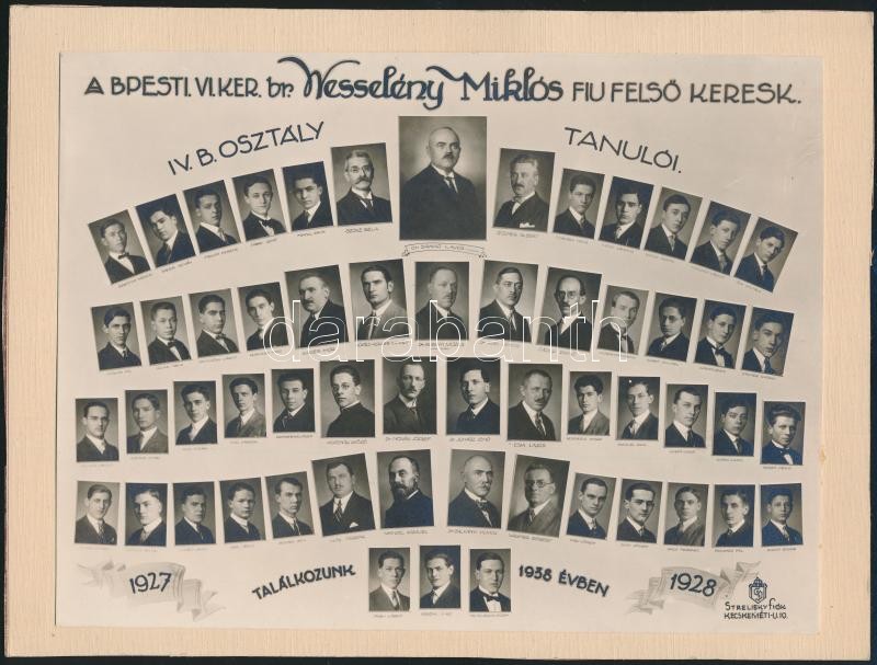 1928 Budapest, Br. Wesselény Miklós Fiú Felsőkereskedelmi Iskola tanárai és végzett növendékei, kistabló nevesített portrékkal, 16,5x22 cm, karton 18,5x24,5 cm