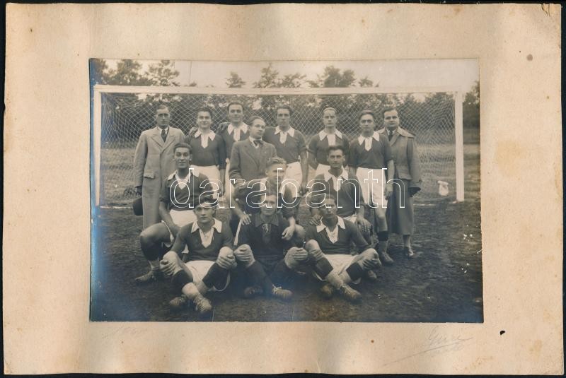 Leírás: 1940 Guzi L. Ernő (1902-?): Az isaszegi focicsapat tagjai, aláírt, hátulján feliratozva, pecséttel jelzett, kartonra ragasztva, 16,5×25 cm