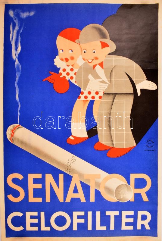 Leírás: 1930 Senator Cerofilter art deco reklámplakát, Janina Rt, Budapest, Fk: Fuchs Vilmos, javított, 94×62 cm