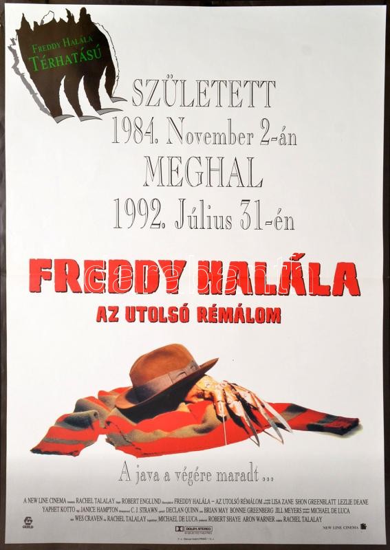 1991 Freddy halála - az utolsó rémálom, filmplakát, hajtott, 80×60 cm ... https://www.darabanth.com/hu/31-Nagyaukcio/31.1/Festmeny-mutargy-papirregiseg-egyeb/Plakat~12802/1991-Freddy-halala-az-utolso-remalom-filmplakat-hajtott-80C39760-cm-Freddys-Dead-The-Fin~II1945070