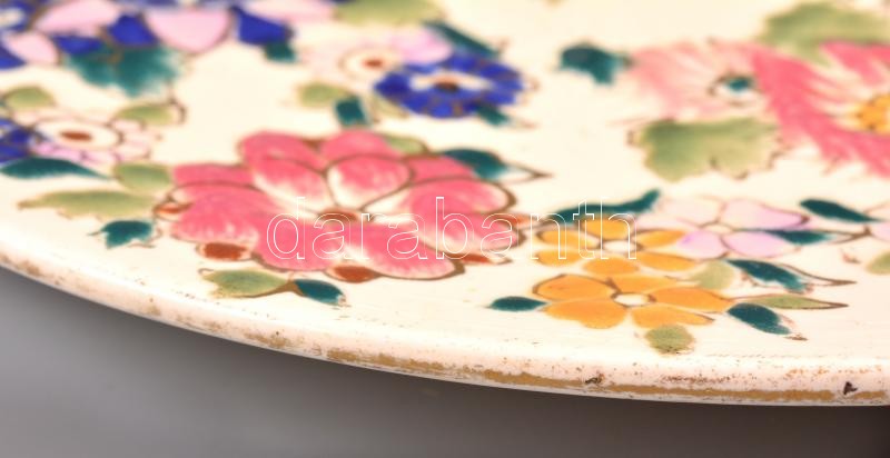 Leírás: cca 1900 Fischer Ignác falitál, kézzel festett, aranyozott porcelánfajansz, festés több helyen lekopott, jelzett "Fischer I. Budapest" d: 30,5 cm / Fischer plate, hand-painted, slightly worn gold paint