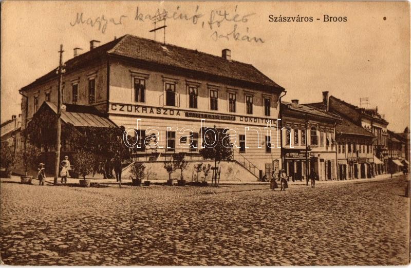 Leírás: 1911 Szászváros, Broos, Orastie; Eisenburger kávéház és cukrászda, Oprean Aurél üzlete / cafe, confectionery and shop