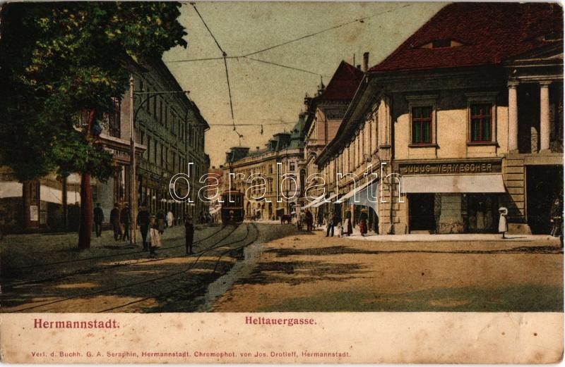 Nagyszeben, Hermannstadt, Sibiu; Disznódi utca, Julius Wermescher üzlete, Római császár szálloda, villamos / Heltauergasse / street view with shops, hotel and tram. G.A. Seraphin von Jos. Drotleff