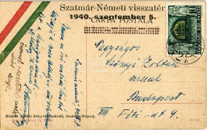 Leírás: Szatmárnémeti, Szatmár, Satu Mare; Dohánybeváltó hivatal. Hollósi felvétele és Huszár Aladár kiadása / Depositul mare de tutun / Tobacco Deposit + "1940 Szatmár-Németi visszatér" (EK)