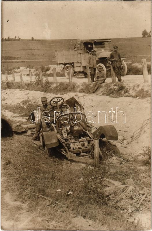 Első világháborús osztrák-magyar katonák teherautóval, autóronccsal pózoló katona / WWI K.u.K. military truck, soldier posing in an automobile wreck. photo