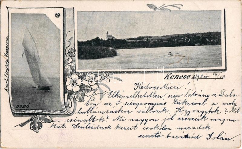 Leírás: 1898 (Vorläufer!) Balatonkenese, Kenese; Dodó, Jánosi Gusztáv ulmi püspök, veszprémi kanonok mélyjáratú vitorlás hajója (Stefánia Yacht Club hajógyár építette). Auor L. fényképész, floral