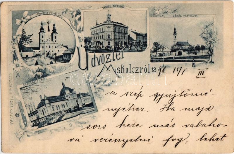 Leírás: 1898 (Vorläufer!) Miskolc, Minorita és görög templom, Városi bérház, Erzsébet fürdő. Gedeon és Társa kiadása. Art Nouveau, floral (EK)