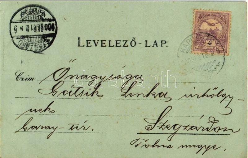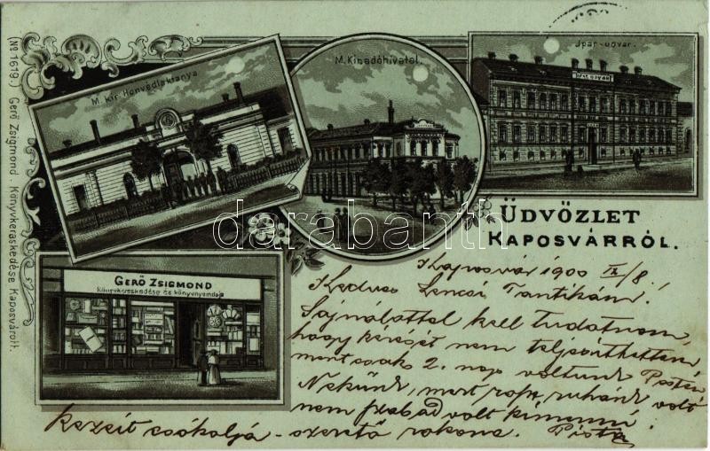 1900 Kaposvár, M. kir. honvéd laktanya, adóhivatal, Ipar udvar, Gerő Zsigmond könyvkereskedése, könyvnyomdája és saját kiadása No. 1619. Art Nouveau, floral, litho