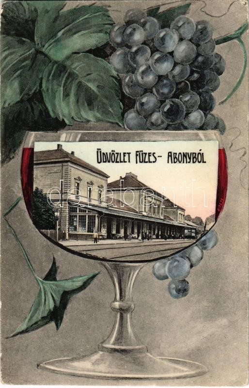 1909 Füzesabony, Vasútállomás. Montázs boros pohárral és szőlővel / Ba... https://www.darabanth.com/hu/31-Nagyaukcio/31.1/Kepeslapok/Magyarorszag~13125/1909-Fuzesabony-Vasutallomas-Montazs-boros-poharral-es-szolovel-Bahnhof-railway-stati~II1936843