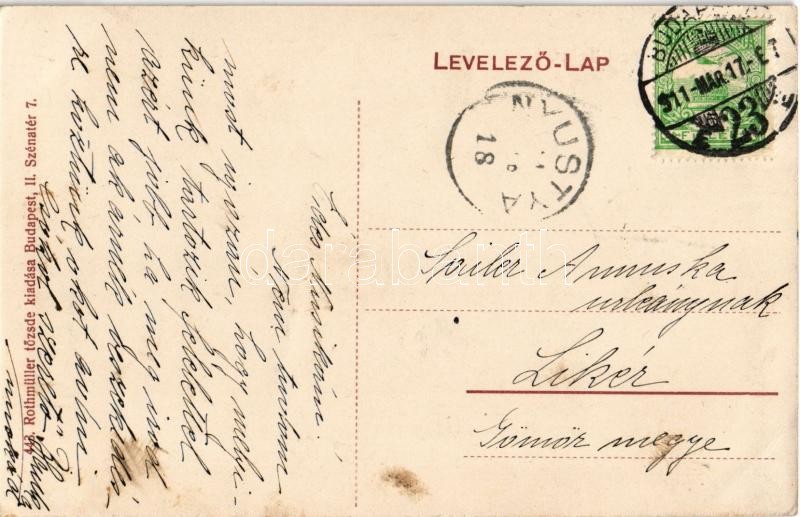 Leírás: 1911 Budapest II. Széna tér, Gyógyszertár, villamos. Rothmüller tőzsde kiadása
