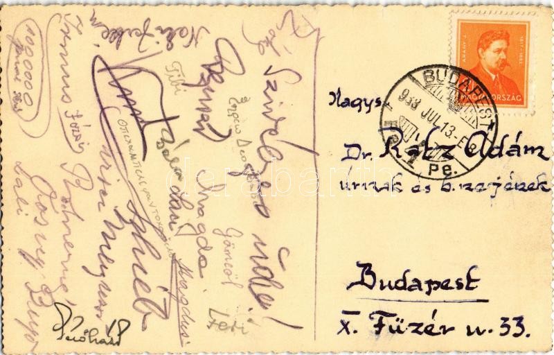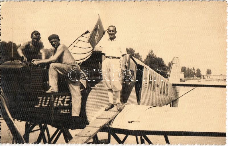 Leírás: 1938 Siófok, Junkers F13 típusú HA-JAD lajstromjelű hidroplán a kikötőben, pilóta, személyzet javítás közben. Hátoldalon aláírások.photo