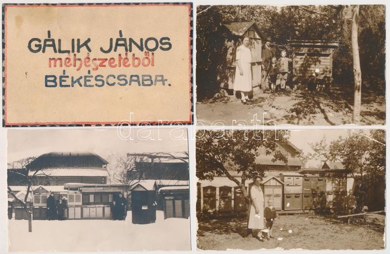 Békéscsaba, Gálik János méhészete, méhkaptárok télen és nyáron - 3 db régi fotó képeslap és egy egyedi fedőlap / apiculture - 3 pre-145 photo postcards, winter + 1 custom-made cover