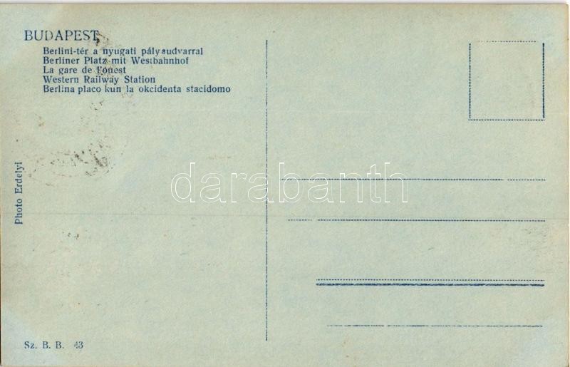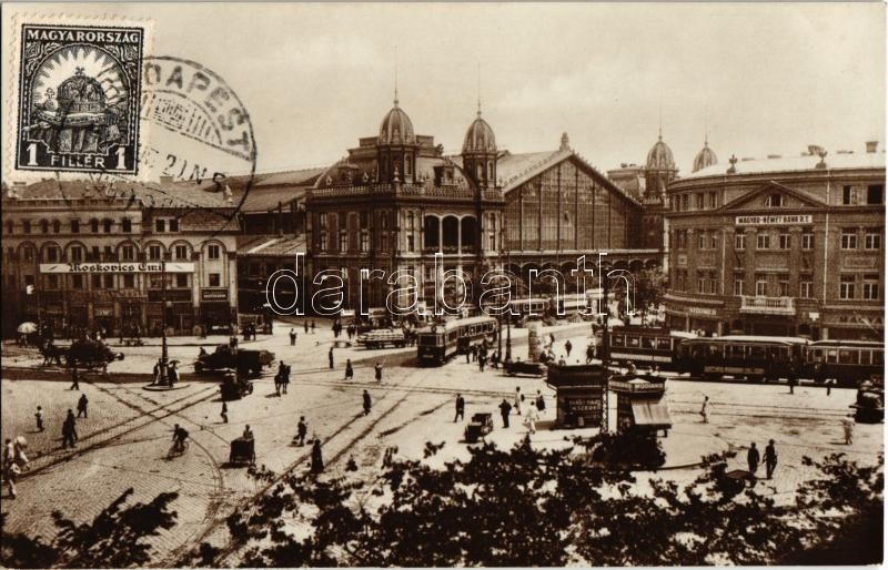 Budapest VI. Berlini tér (Nyugati tér), Nyugati pályaudvar, vasútállomás, villamosok, Magyar-Német Bank Rt., Moskovics Emil, Stühmer üzlete, hentes, teherautó, kerékpár. Photo Erdélyi