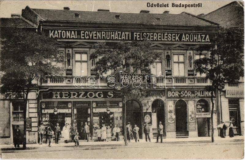 Budapest VIII. Herzog S. Katonai és Egyenruházati Felszerelések Áruháza, Pirsli János étkezdéje, bor, sör és pálinka mérése, Goldmann üzlete, Brankov István fodrász; Üllői út 50. (EK)