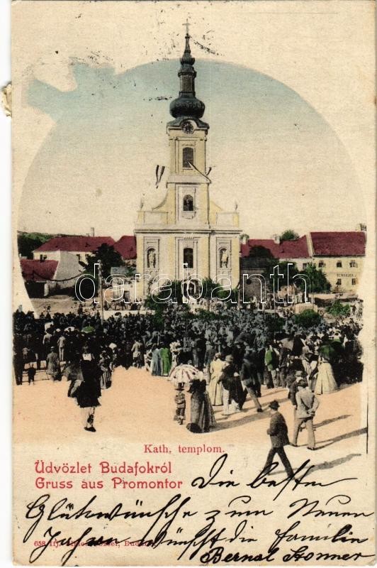 Leírás: Budapest XXII. Budafok, Promontor; katolikus templom, tömeg, magyar zászlók. Ifj. Simon József kiadása (fl)