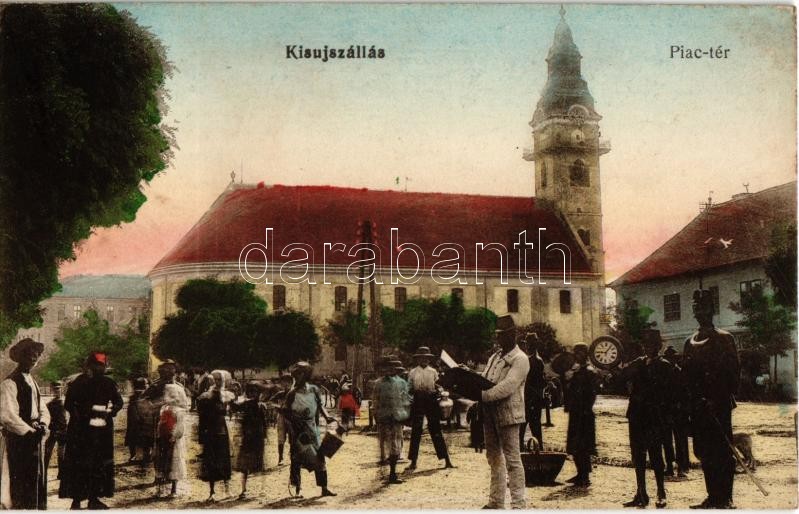 Kisújszállás, Piac tér árusokkal, templom, az előtérben kihirdetés és felolvasás rendőr jelenlétében, fiú órával / Market vendors with reading in front of a policeman, boy with a clock