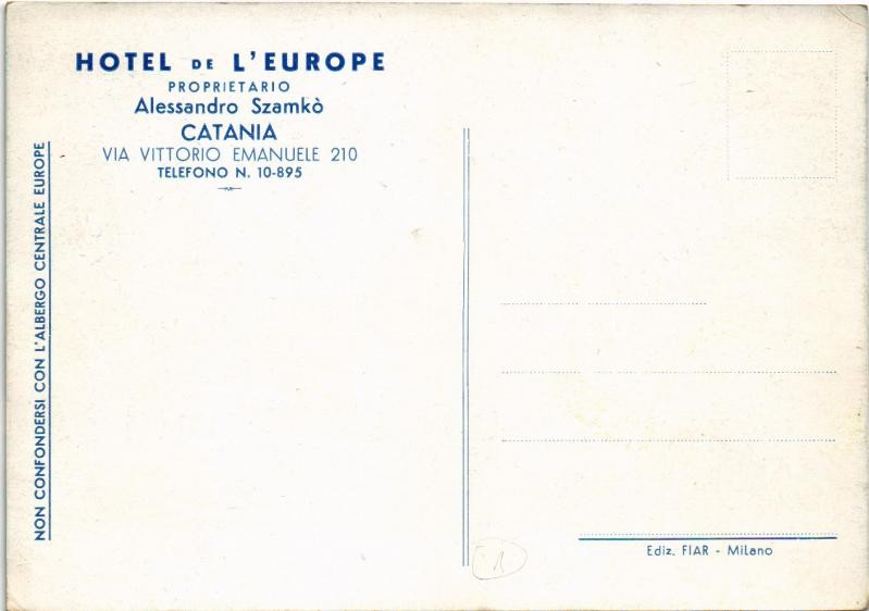 Catania, Via Vittorio Emanuele 210. Hotel de L'Europe (proprietario Alessandro Szamkó) / graphic hotel advertisement card, Mount Etna. artist signed (EK)