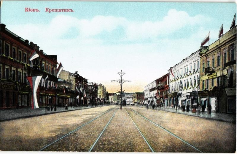 Kiev, Kiew, Kyiv; Rue Krechtchatik / Khreschatyk street, tram, shops, ... https://www.darabanth.com/hu/31-Nagyaukcio/31.1/Kepeslapok/Ukrajna~13193/Kiev-Kiew-Kyiv-Rue-Krechtchatik-Khreschatyk-street-tram-shops-Russian-flags~II1932998