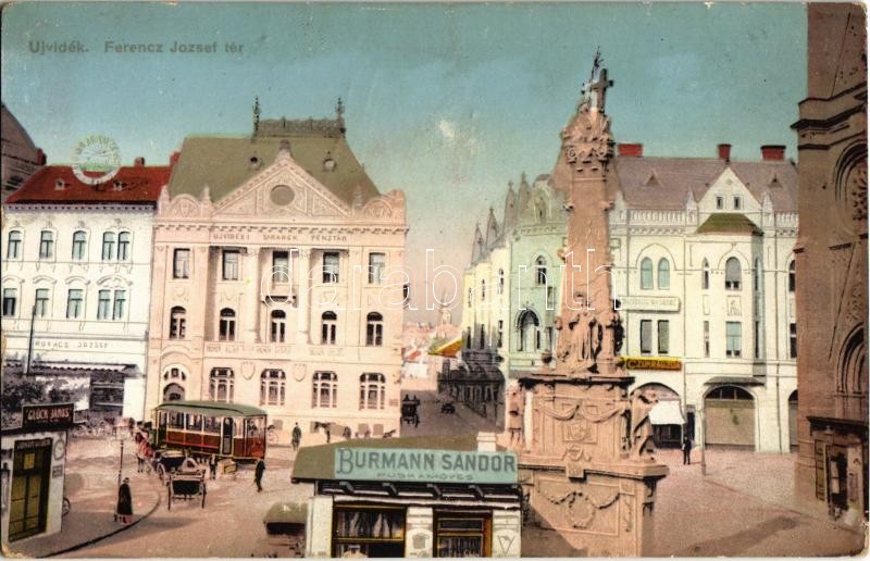 Újvidék, Novi Sad; Ferenc József tér, Szentháromság szobor, biztosító társaság, cukrászda, Burmann Sándor puskaműves, Takarékpénztár, Kovács József és Glück János üzlete, villamos. Singer J. kiadása / square, Trinity statue, insurance company, confectionery, shops, savings bank, tram, gunsmith