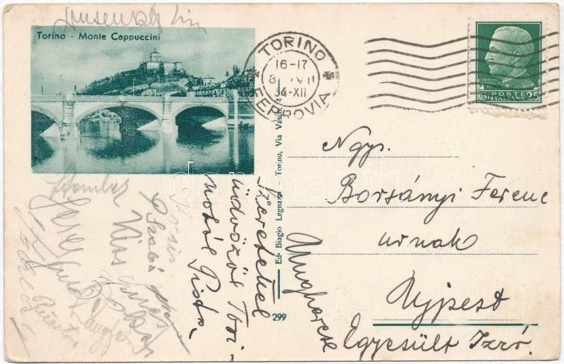 Leírás: 1934 Újpesti játékosok (Kocsis, P. Szabó, Seres, stb.) aláírásai Torinóból küldött levelezőlapon