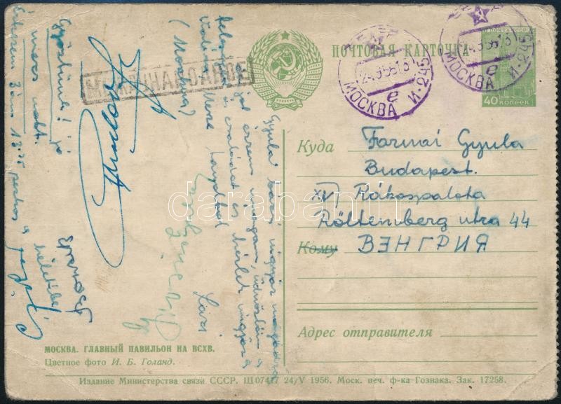 Leírás: 1954 A magyar labdarúgó-válogatott tagjainak (Grosics, Czibor, Bozsik, stb.) aláírásai Moszkvából küldött levelezőlapon