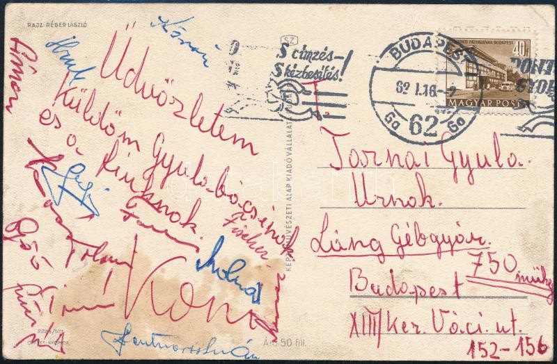 Leírás: 1962 Magyar labdarúgók (Fischer, Molnár, stb.) aláírásai levelezőlapon