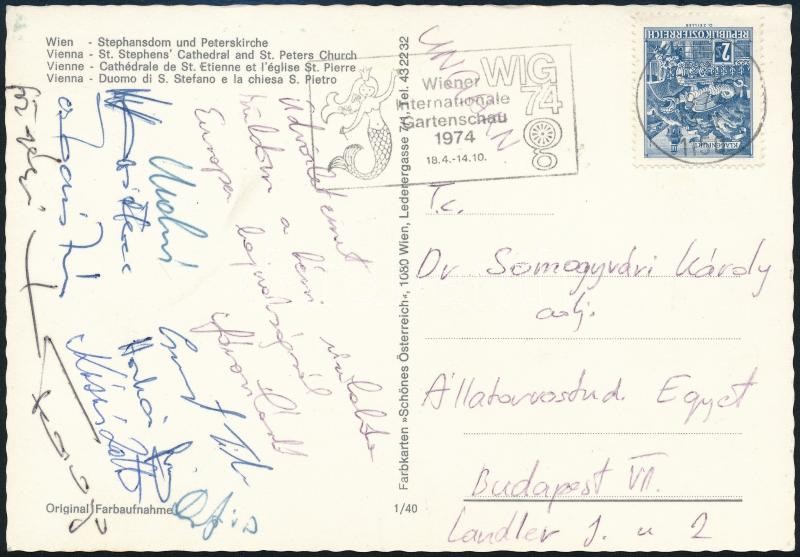 Leírás: 1974 A magyar vízilabda válogatott által aláírt képeslap a bécsi eb-ről küldve, köztük Faragó Tamás, Horkai György, Kásás Zoltán