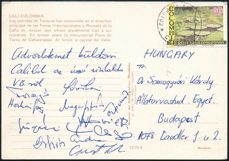 Leírás: 1975 A magyar vízilabda válogatott által aláírt képeslap a kolumbiai vb-ről küldve, köztük Faragó Tamás (1952-) Horkai György (1954-)