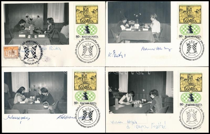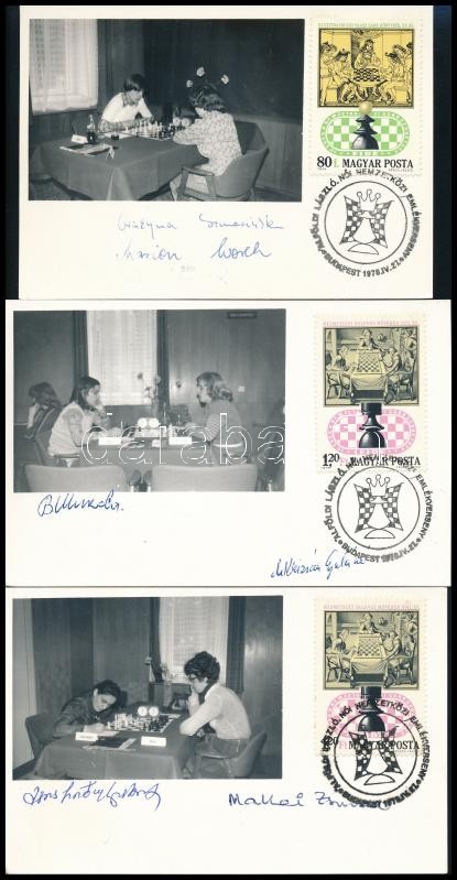 Leírás: 1978 Alföldi László Női Nemzetközi Sakk Emlékverseny részvevői által aláírt 7 db fényképes levelezőlap, 9x14 cm