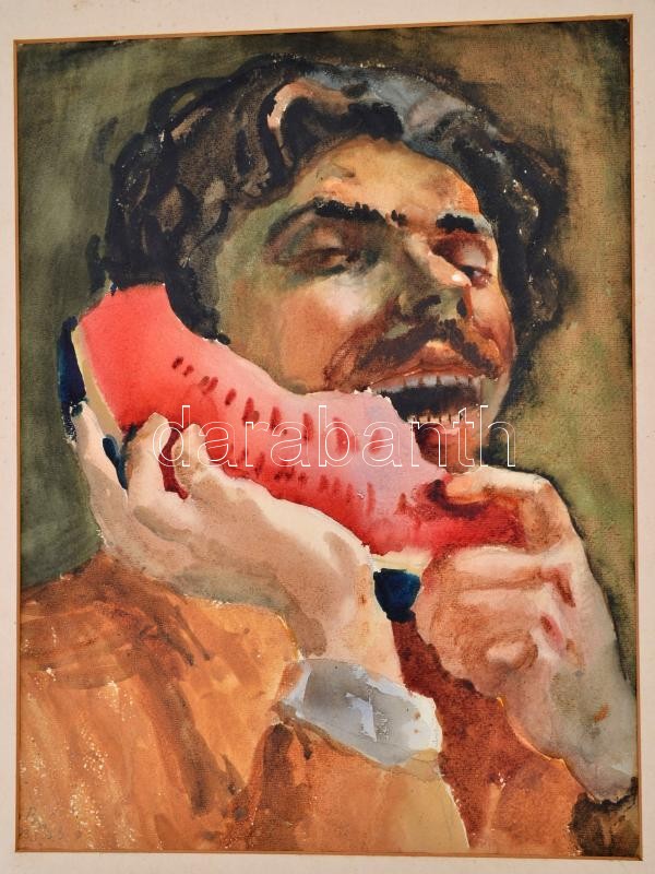 Leírás: Csebi Pogány István (1908-1979): Önarckép dinnyével. Akvarell, papír, jelzett, 49×38 cm