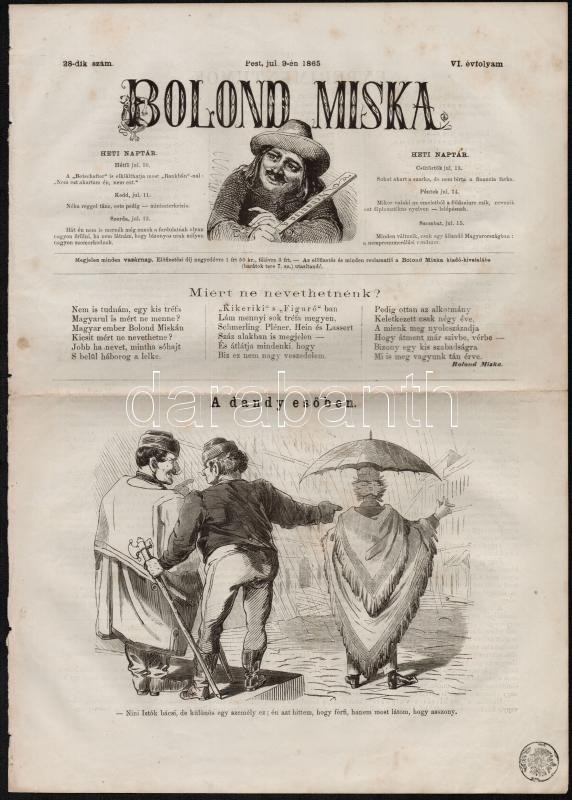 Leírás: 1865 Bolond Miska élclap 1865. július. 9. VI. évf. 28. száma. Szerk.: Szokoly Viktor. Bp., Emich Gusztáv, a címlap alsó sarkán bélyegzéssel, 4 p.