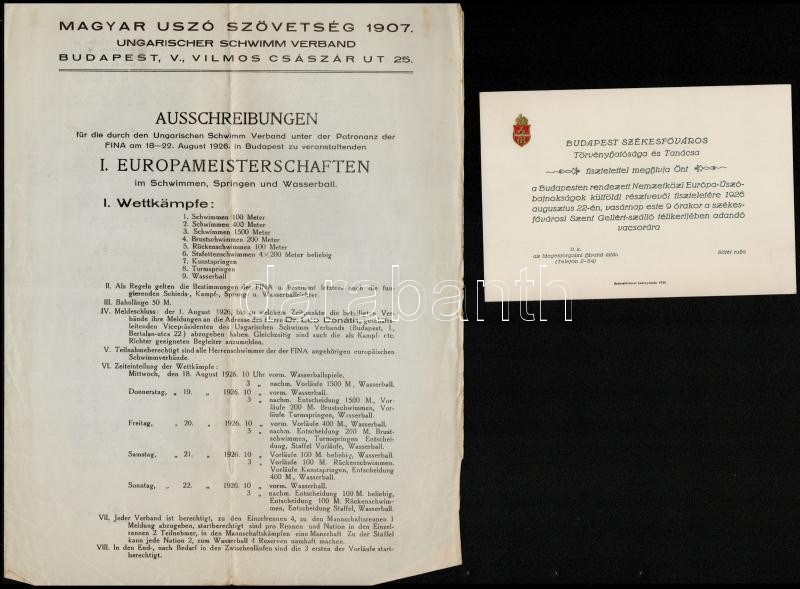 Leírás: 1925-1926 Az úszó EB német nyelvű programja + polgármesteri vacsorameghívó