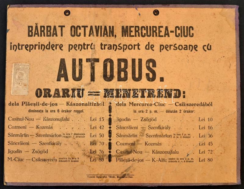cca 1920 Erdélyi (Csíkszereda) kétnyelvű buszmenetrend, 27×35 cm https://www.darabanth.com/hu/310-Gyorsarveres/310.0/Festmeny-mutargy-papirregiseg-egyeb/Nyomtatvanyok~28/cca-1920-Erdelyi-Csikszereda-ketnyelvu-buszmenetrend-27C39735-cm~II1691523