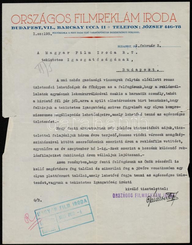 1931 Országos Filmreklám Iroda díszes fejléces levél, 29x22,5 cm https://www.darabanth.com/hu/310-Gyorsarveres/310.0/Festmeny-mutargy-papirregiseg-egyeb/Okmanyok~17/1931-Orszagos-Filmreklam-Iroda-diszes-fejleces-level-29x22-5-cm~II1692142
